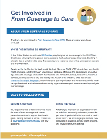 Your support is vital to help new enrollees and other patients make the most of their coverage and access preventive services to support their health goals. Getting involved is simple. If you have any questions email us at coveragetocare@cms.hhs.gov.